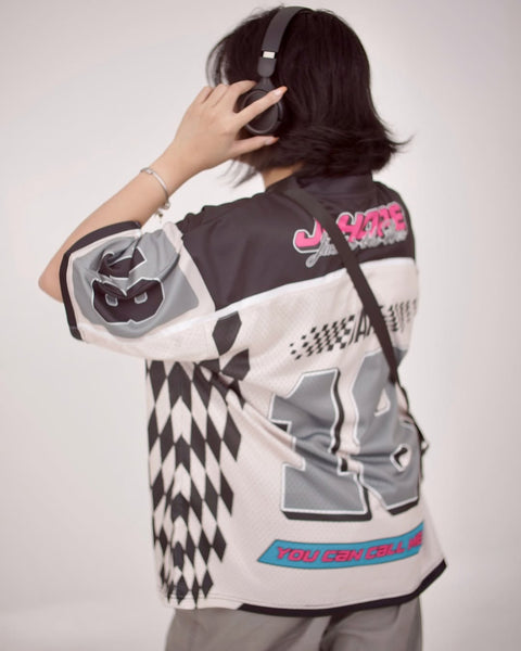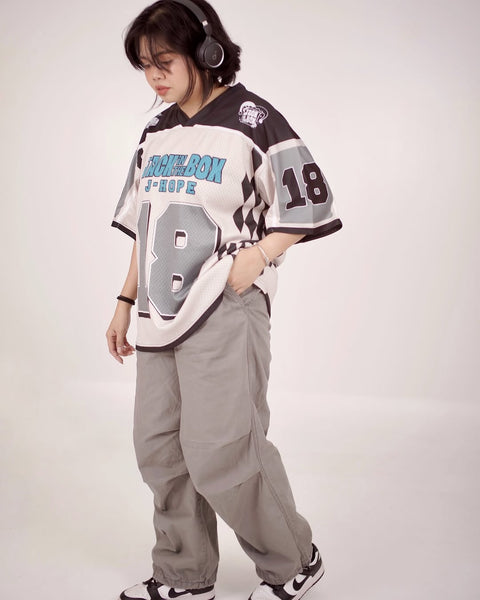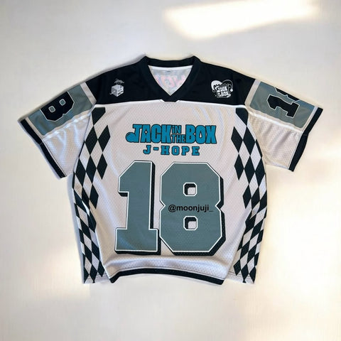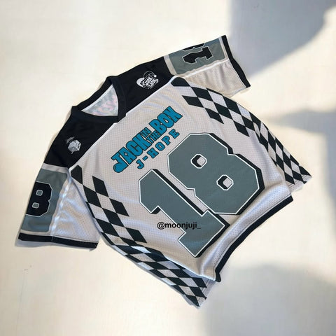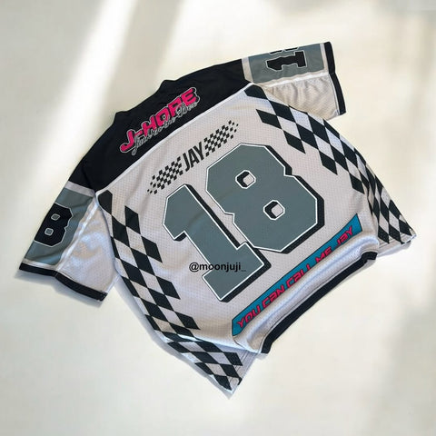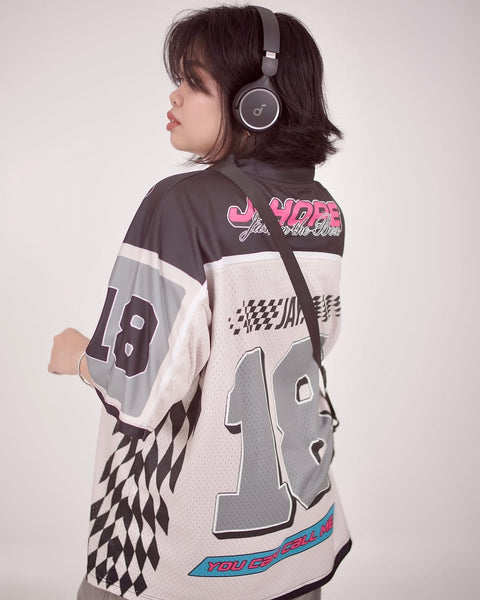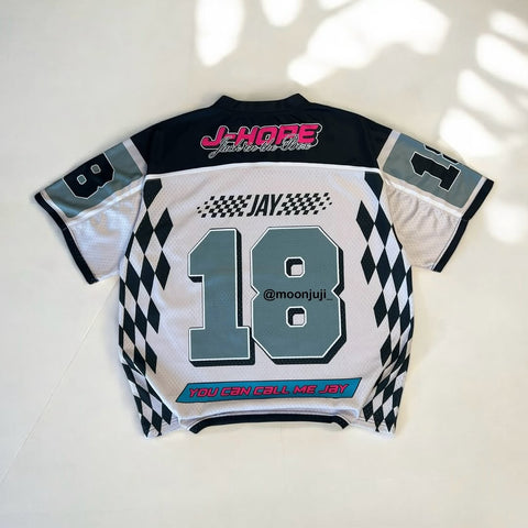 π Signature βHope On The Streetβ Back Print β Featuring βJ-Hopeβ, racing stripes, oversized β18β, and checkered edge designs that scream retro-sport cool.